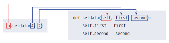 - __init__ 메서드가 호출되면 setdata 메서드를 호출했을 때와 마찬가지로 first와 second라는 객체변수가 생성된다.